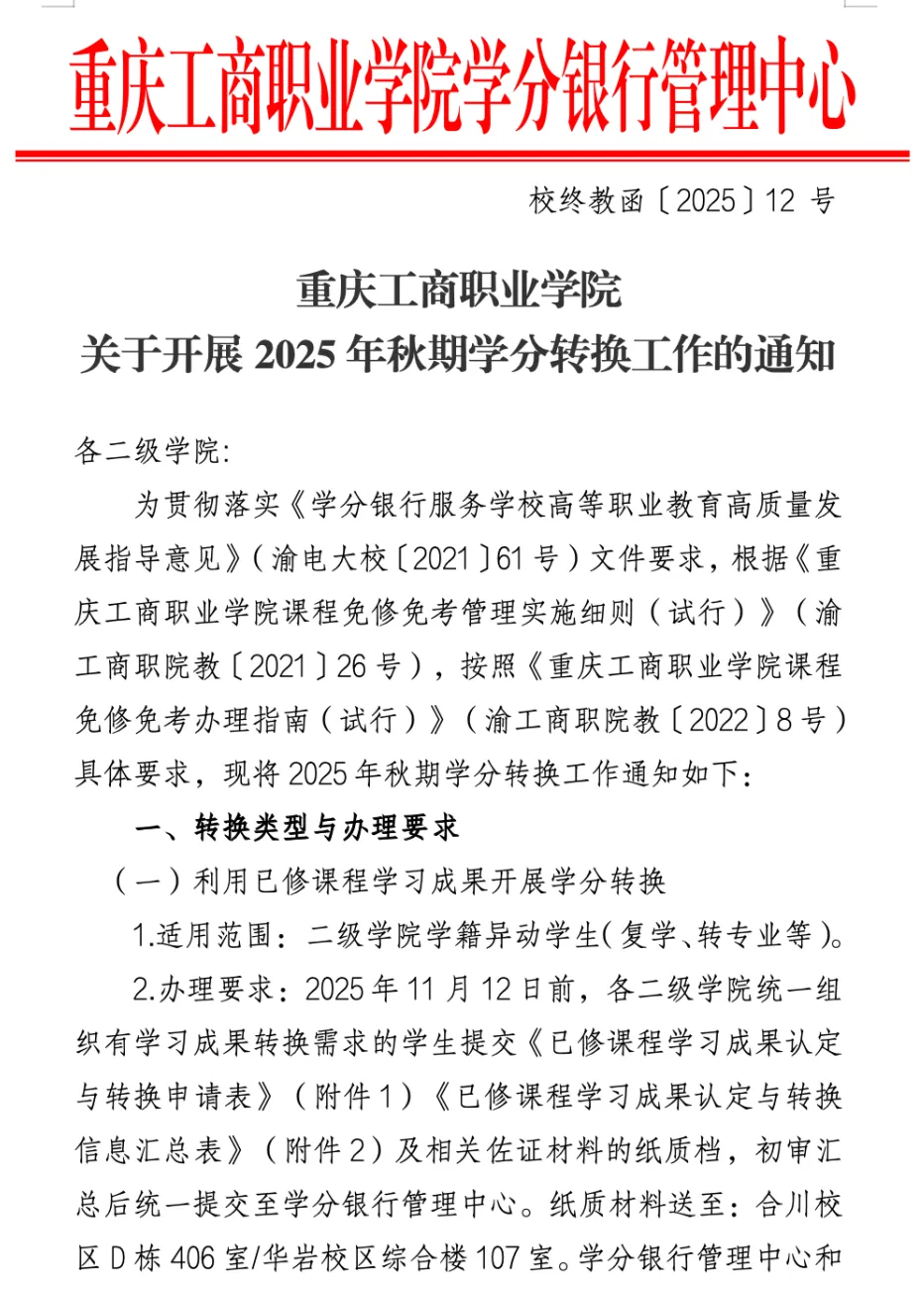 重庆工商职业学院 关于开展2025年秋期学分转换工作的通知